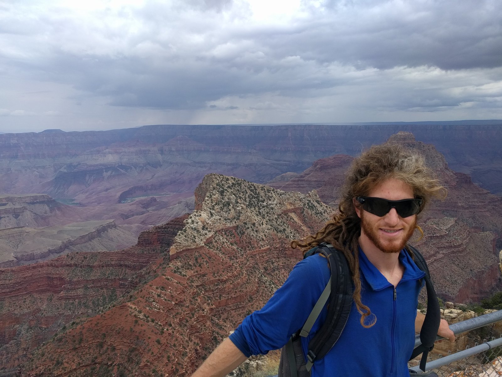 Mikey is smiling, standing near a cliff. Behind him is a natural bridge, and reddish canyons that make up the Grand Canyon.