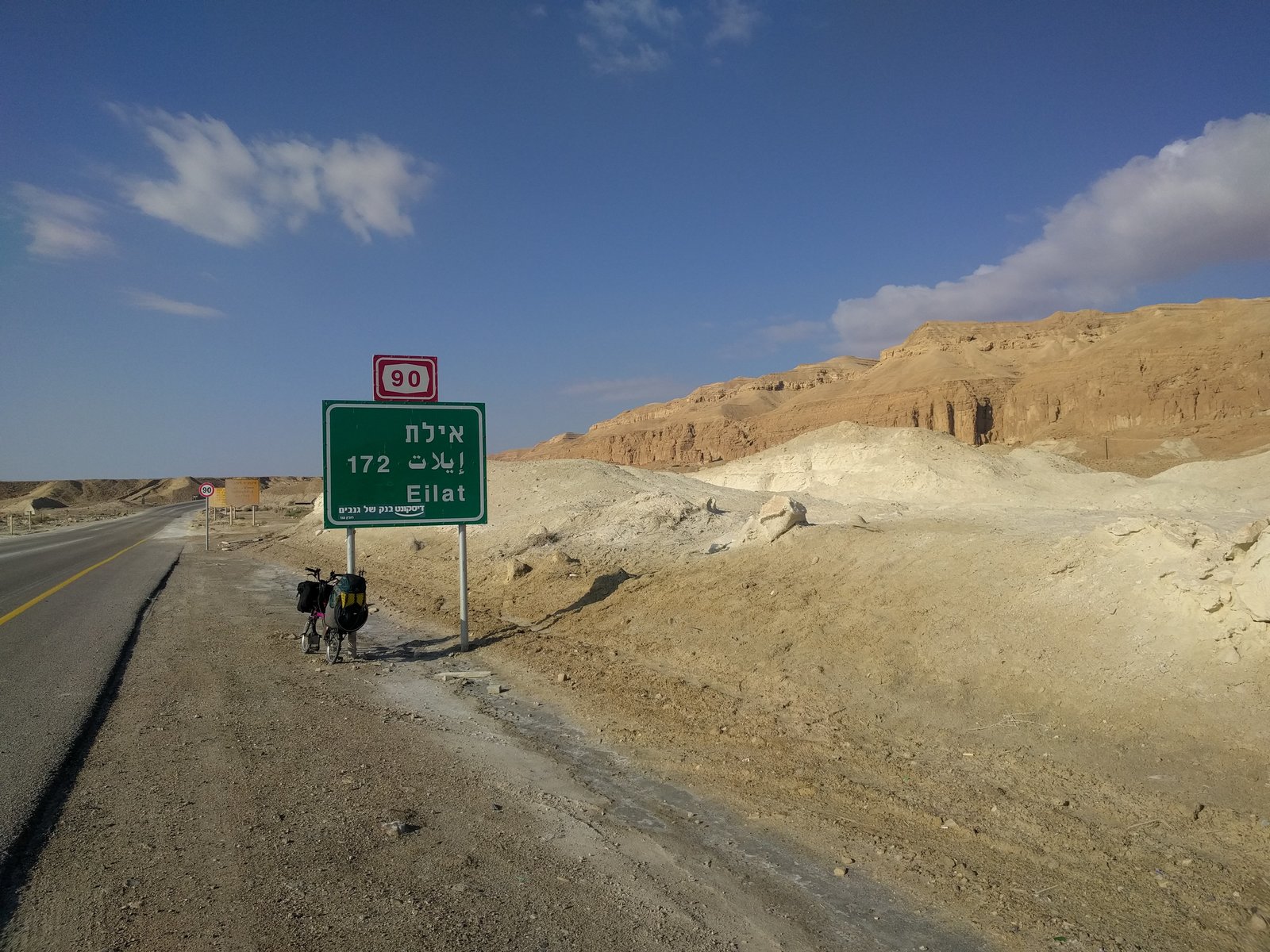 My time in Palestine ended with a ride from the Golan Heights in occupied Syria at the headwaters to the Jordan river down to the Red Sea at Eilat–400 km away. I cycled from the mountains to the Dead Sea and continued south through the Negev desert.